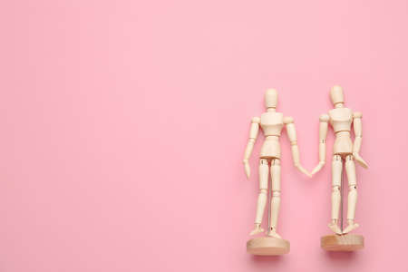 Man and woman connection. Couple of wooden mannequin figures.