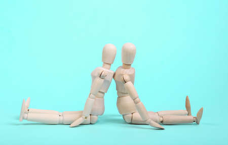 Wooden puppets in a quarrel sit back to back on a blue background