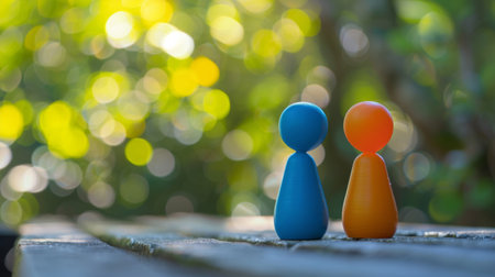 Two small orange and blue figures standing on a wooden table, AI