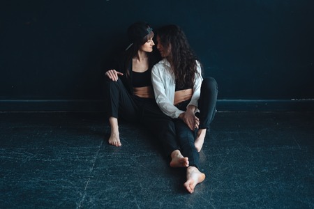 beautiful girls sit by the wall and pose