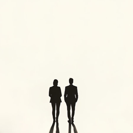 Silhouette of two business people standing back to back against a white background