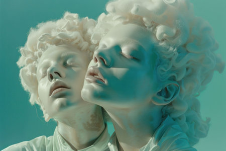 Two figures in formal attire stand confidently against a blue wall their faceless appearance creating an intriguing visual impact.