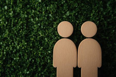 Two wooden figures representing a couple on a green foliage background, symbolizing love, togetherness, and harmony in relationships
