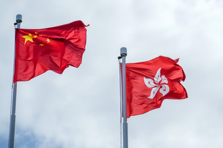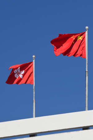 Flags of China and Hong Kong SAR catching the wind with blue sky behind