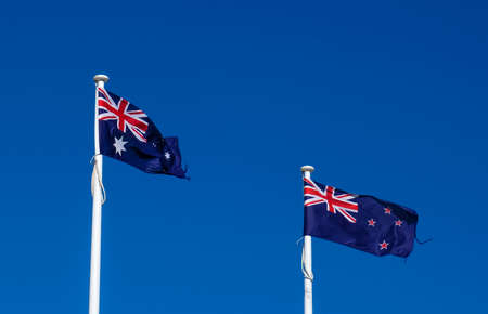 Waving flags of New Zealand and the Fiji Island at blue sky. A symbol of political and economic relations between two countries. Partnership and competition in the world stage.