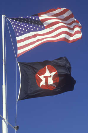 The state flag of Texas and American flag waving in the wind on flagpole. Blue sky background with copy space. Vintage filter effects.