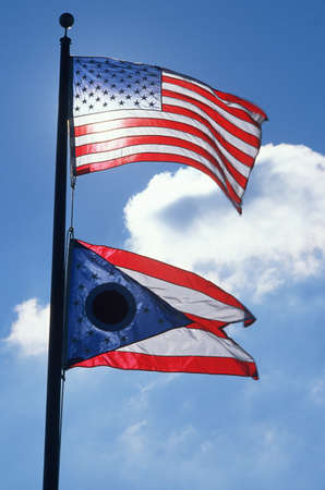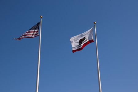 Flags of California and of the United Stated waving over the sky in a warm sunset light