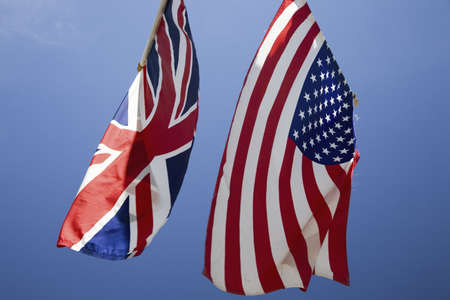 Stars and Stripes and Union Jack - US and UK national flags against the blue sky