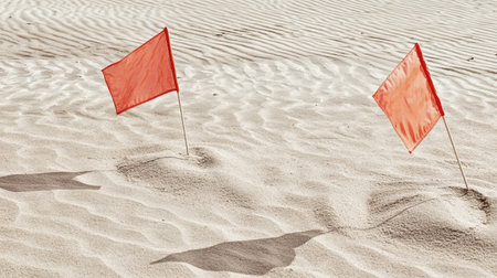 Two vibrant red flags stand out against a vast sandy desert landscape, casting shadows on rippled sand. The scene evokes feelings of adventure and warmth.