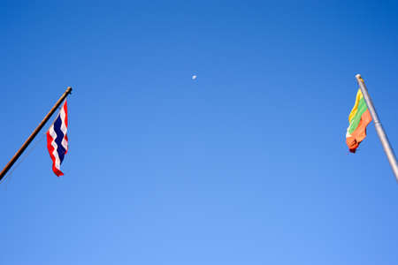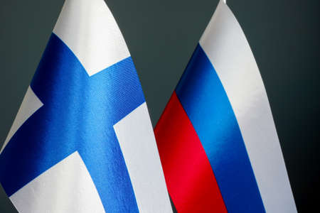 Flags of Sweden and the Russian Federation flutter in the wind against the blue sky. The concept of national symbols, international relations, and sports games. Close up shot