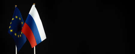 EU and Russia flags on black background. Sanctions pressure, politics concept photo. Europe union vs Russia. Copy space banner