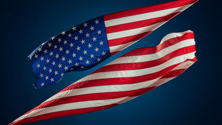 Monochrome composition of two american flags on poles billowing in opposite directions on cloudy sky. patriotism, independence and celebration concept digitally generated image. onoi