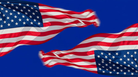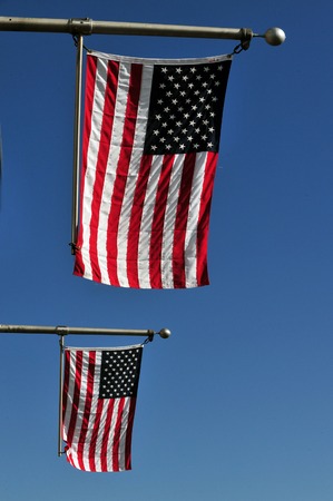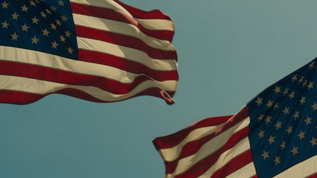 Two American flags blowing in the wind against a blue sky with a bright sun.