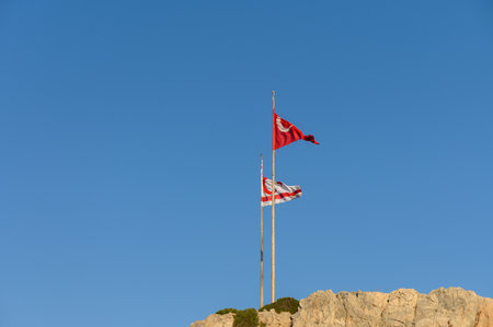 Two flags, one of Tunisia and the other representing the local community, flutter elegantly under a clear sky.