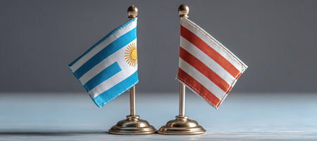 Close-up of miniature Argentina and Chile flags on a polished metal base. The vibrant blue-white and red-striped patterns stand out against a clean, neutral background.