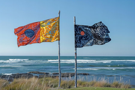 The aboriginal flag is flying in front of the ocean with a clear blue sky, photo taken from a distance. the style resembles that of an artist.
