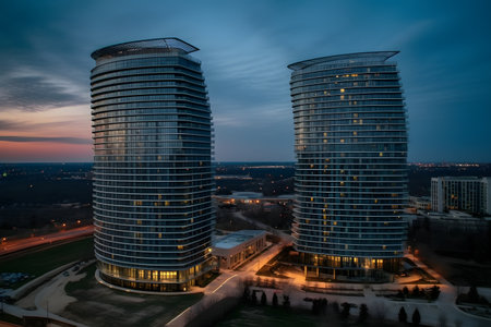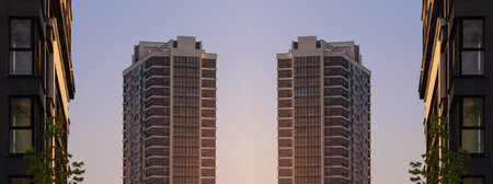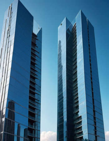 A stunning view of modern twin towers framed by a clear blue sky, showing casing architectural brilliance.