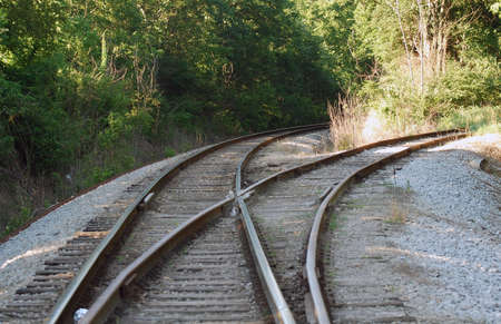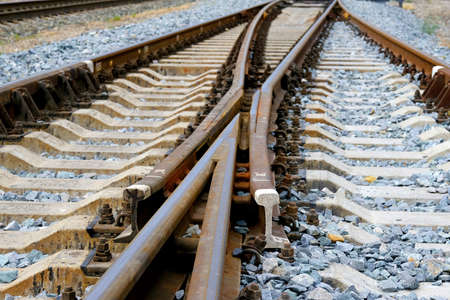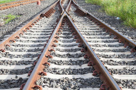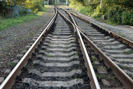 The divergence of two railway tracks that have not been used for a long time. Rusty iron rails. Wooden sleepers. The grass is not mowed. Railway tracks have not been used for a long time.