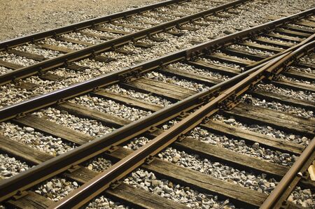 The close-up of Iron rails for the railway on gravel stones,Vintage tone