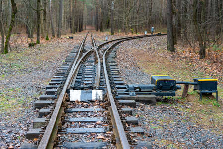 Photo of a fairy-tale railway in the forest. Railway junction.
