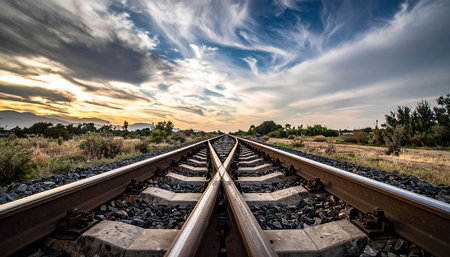 Explore the beauty of tranquil railway tracks at sunset, showcasing the harmony of nature and travel. Ideal for themes of exploration and serenity.