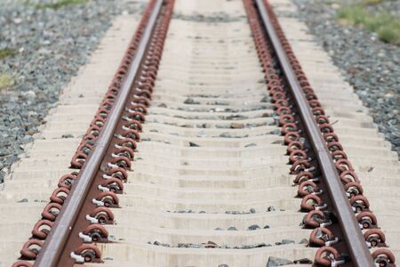 rails and sleepers, railroad and stones. Railway traffic, Perspective. Metal rails with concrete sleepers Close-up. Black and white monochrome