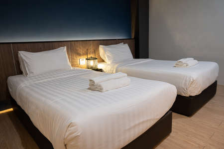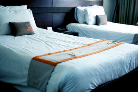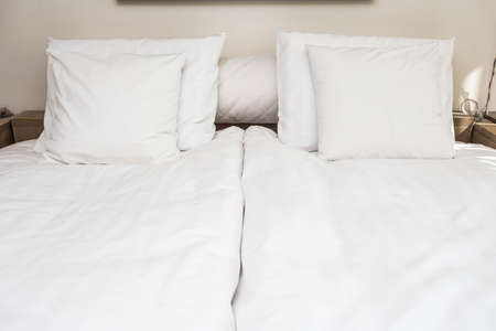 White clean comfortable pillow on two bed decoration interior of hotel bedroom of brown background - Hotel bed with space for text and beautiful