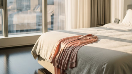 Two snow-white bath robes in sunlight, beautifully folded, lie on a bed covered with white linen. good morning at the hotel