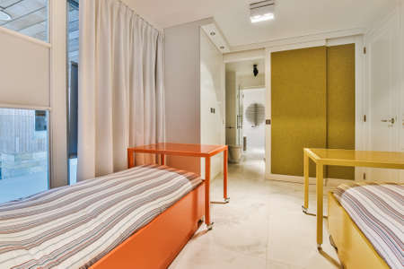 Two colorful beds with metal tables in simple light room with curtain on window and opened door to washroom