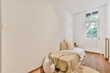 Home interior design of bedroom with bed and wooden wardrobe placed in corner near window in modern apartment
