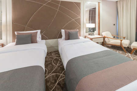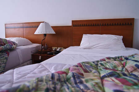Twin comfortable bed in hotel bedroom. Conceptual shot of a place for someone to stay, live, or work temporary.