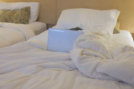 Blurred photo of a bed with a laptop on the table. Workplace in a small apartment. Photo with selective focus