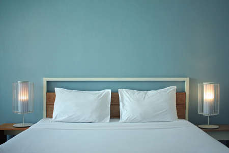 This interior shot features a meticulously arranged bed with soft pillows and a textured blanket. Two lamps flank the bed, casting a warm glow against the neutral-toned walls. The overall ambiance is tranquil with subtle shadows suggesting an evening setting, perfect for various commercial applications.