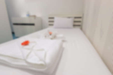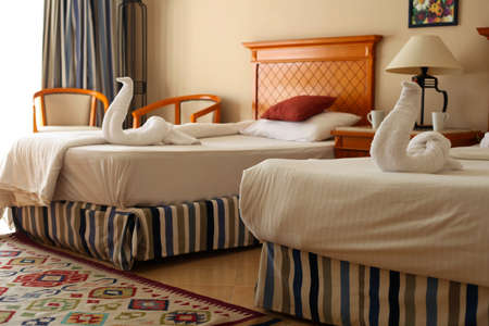 Bedroom interior design with swans from the towel decoration on bed. Inrerior home design