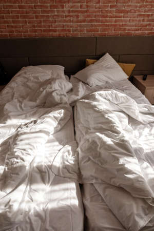 On a bed in bedroom the rays of the sun fall. Comfortable bed with white linen at home