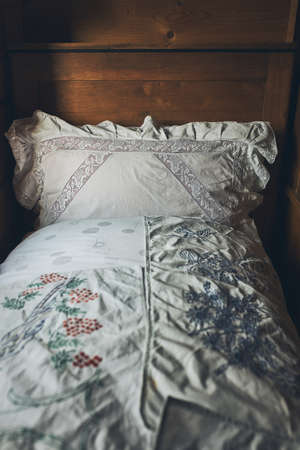 Close-up of a part of wooden bed with linen and pillows and a side cabinet with fresh cut flowers in a vase on top standing against a white wall in a bright bedroom interior. Panorama. Real photo.