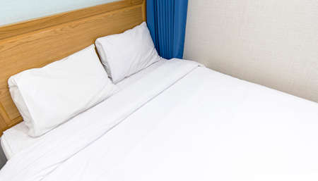 Bed maid-up with clean white pillows and bed sheets in beauty room. Close-up. Lens flair in sunlight.