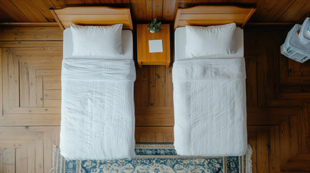 Neatly styled twin beds with matching sheets and shared nightstand from a top-down view
