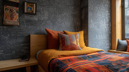 A stylish bedroom showcasing unique chalkboard walls filled with artistic details, complemented by a cozy bed adorned with vibrant pillows and textures, offering a warm retreat.