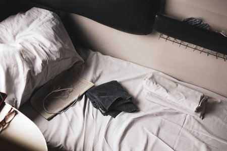 Cropped shot of minimalistic modern bedroom interior with comfy soft bed decorated with gray bedding, selective focus on open blank notepad or book on cover, blurred background