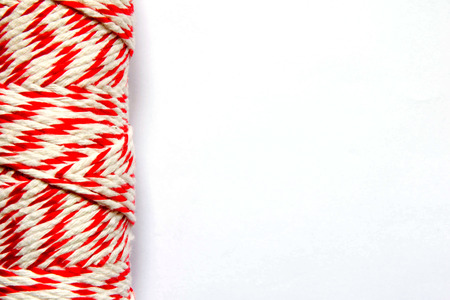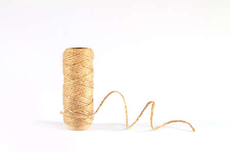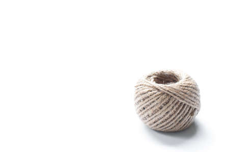 Top view roll of cotton natrue string twine on white background and space for text. Crafting supply, decoration book, or tie a present box.