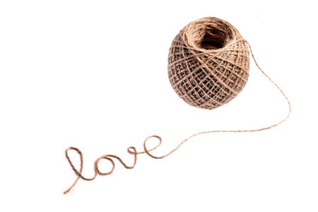 A skein of brown twine with a loose thread on a white background. A ball of jute twine. View from above.