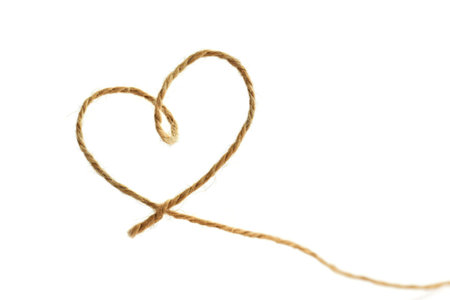 A close-up shot features a single strand of natural twine artfully twisted into the shape of a heart against a clean white backdrop.