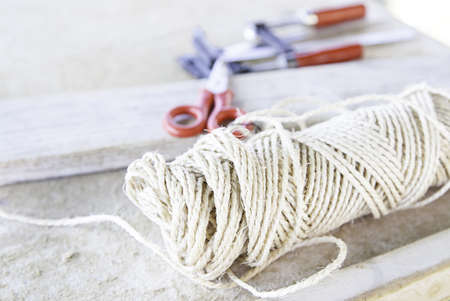 Skein jute twine and burlap on a wooden background. Rustic style. Selective focus.