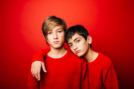 Two Pre-adolescent boys, wearing a red sweater, embracing over a red background