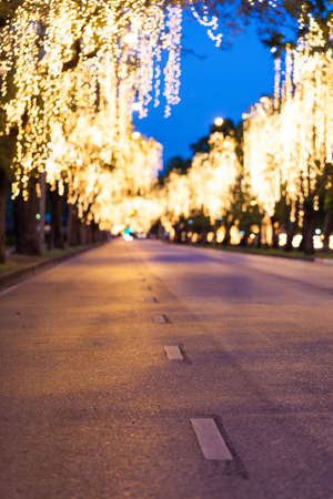 Image of night festival on street blurred background with bokeh, bulb lighting twilight, concept of chrismas lighting.
