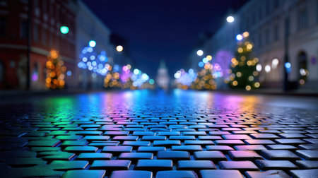 A serene nighttime view of a cobblestone street adorned with vibrant Christmas lights, creating a magical atmosphere in a tranquil urban setting.