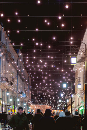Night street with Christmas decoration in Moscow, Russia. Winter night cityscape. Glowing festive garlands and lights