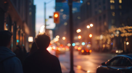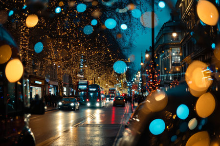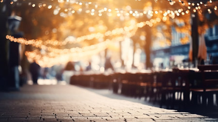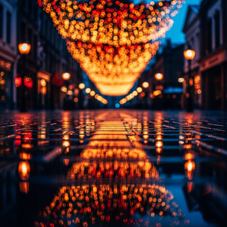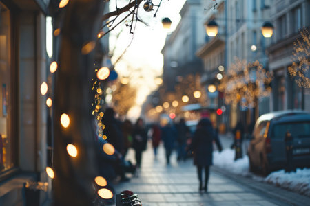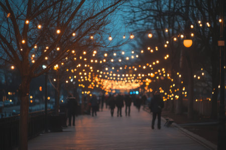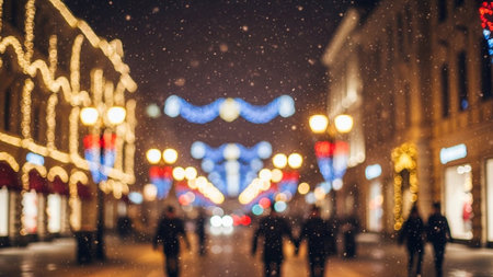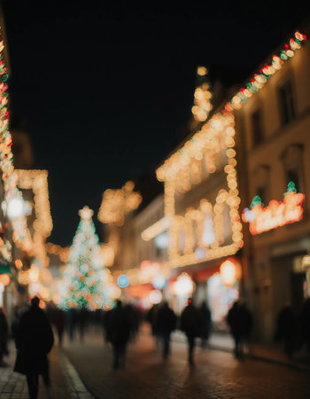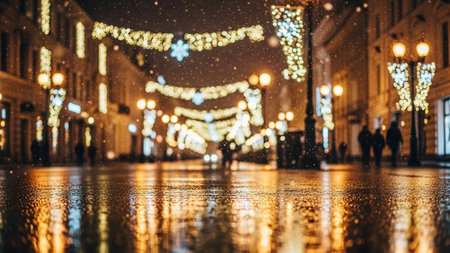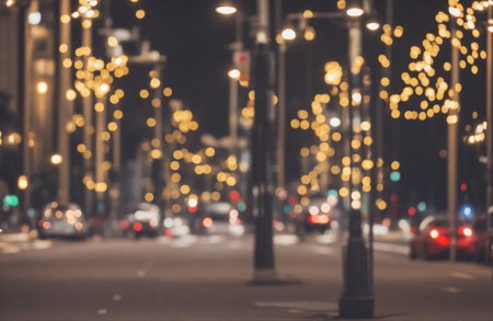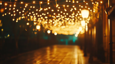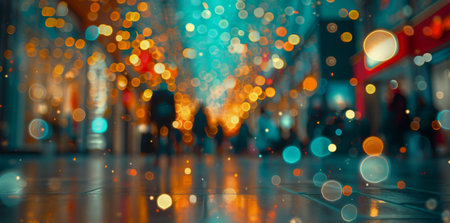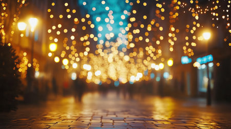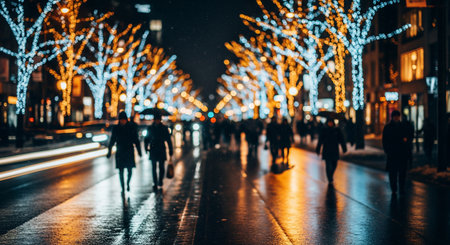 A blurred city street at night, illuminated by warm, glowing bokeh lights from festive decorations and street lamps,...