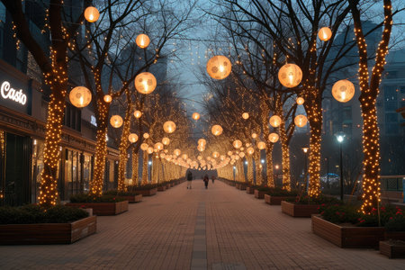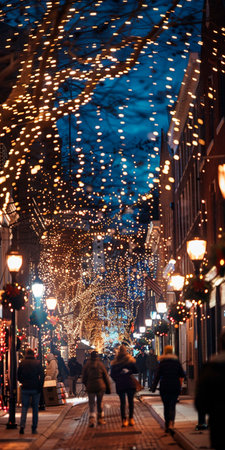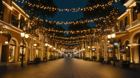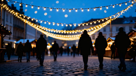 Twinkling holiday garlands glow above a lively street as people stroll and enjoy the festive atmosphere during the evening hours of a charming town. Generative AI.